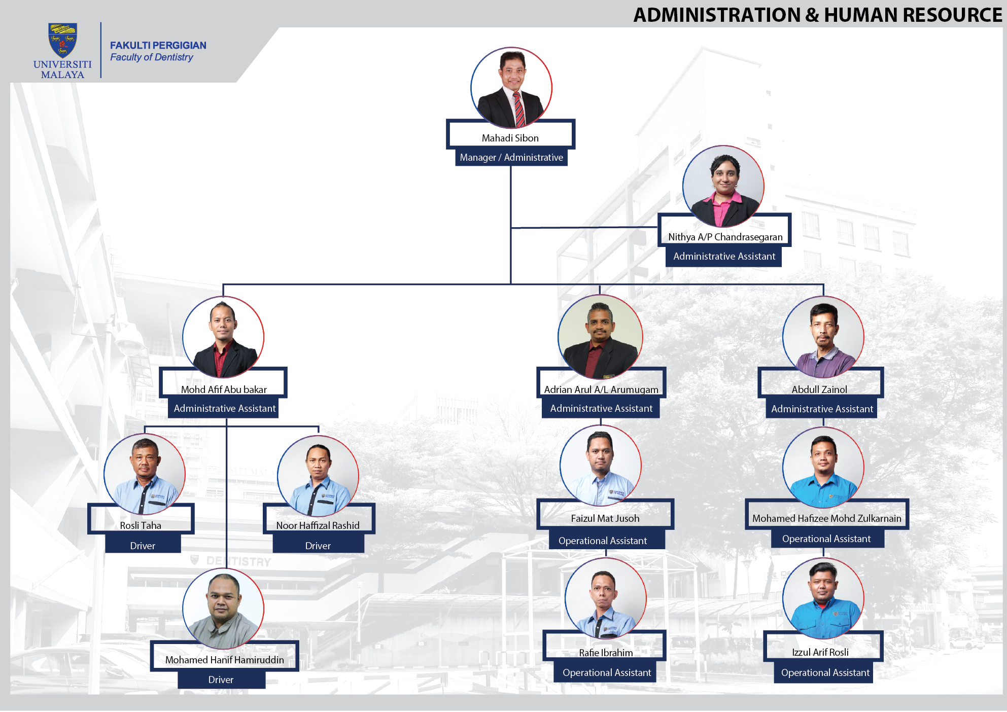 The Dental Development Office (DDO) coordinates the faculty's efforts to upgrade, maintain and preserve the faculty’s facilities so that the process of teaching and learning and clinical services can take place effectively while providing a pleasant and conducive environment for its staff, students, patients and visitors who come to the faculty. These are made possible through an effective, committed, and dynamic management team. We will continue to work closely with the faculty to ensure all faculty projects are carried out competently within appropriate cost and time.